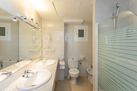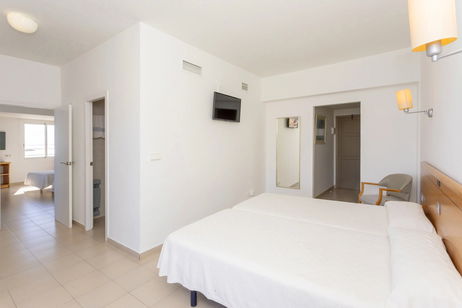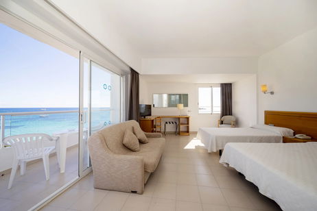 Room of 80mts2, very spacious and bright. It consists of two connecting rooms with a large bathroom to share. Both rooms have single beds, air conditioning, satellite TV, free Wi-Fi, balcony and seaview. Ideal for families or group of friends.