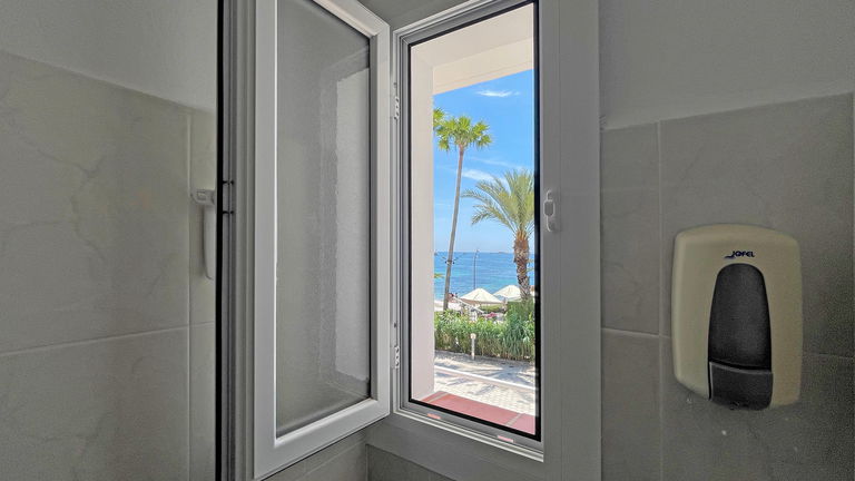 Habitación doble con dos camas individuales. Dispone de baño privado y balcón o terraza con vista mar lateral.